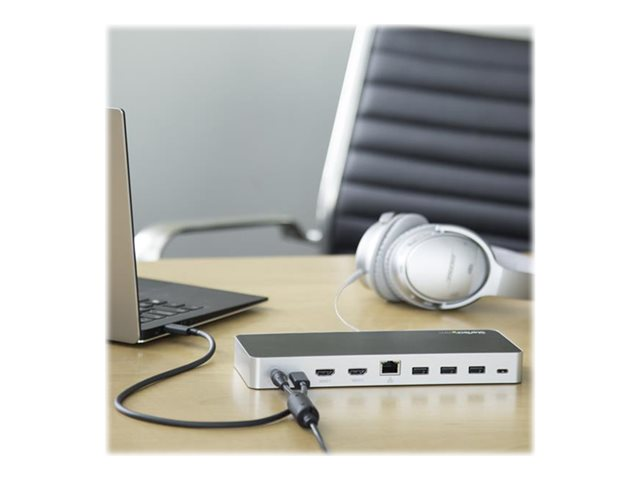 Améliorez votre productivité en transformant votre ordinateur portable USB-C Windows en poste de travail complet. Cette station d'accueil USB-C double affichage permet de connecter facilement deux écrans HDMI ou DVI (avec adaptateurs inclus) à l'aide d'un câble USB-C, sans avoir à configurer de pilotes graphiques dès la sortie de l'emballage. La station d'accueil USB-C génère une puissance de charge de 60 W et intègre cinq ports USB 3.0 pour connecter des appareils. Grâce à la simplification de la configuration de deux écrans, elle est idéale pour une utilisation massive dans un environnement bureautique.
