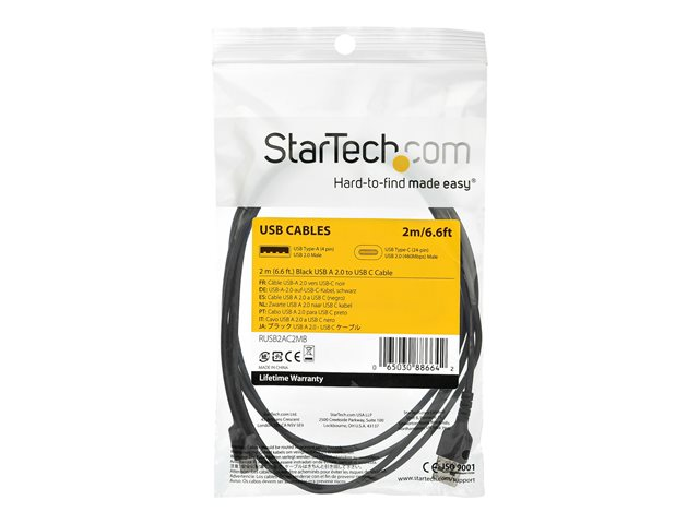 StarTech.com Câble de Chargement 2m USB A vers USB C - Cordon USB 2.0 vers USB-C à Charge/Synchronisation Rapides - Gaine TPE en Fibre Aramide M/M 3A Noir - Samsung S10/iPad Pro/Pixel (RUSB2AC2MB) - Câble USB - USB (M) droit pour 24 pin USB-C (M) droit - Thunderbolt 3 / USB 2.0 - 2 m - noir - pour P/N: CDP2HDUACP2, SECTBLTDT, STNDTBLTMOB RUSB2AC2MB