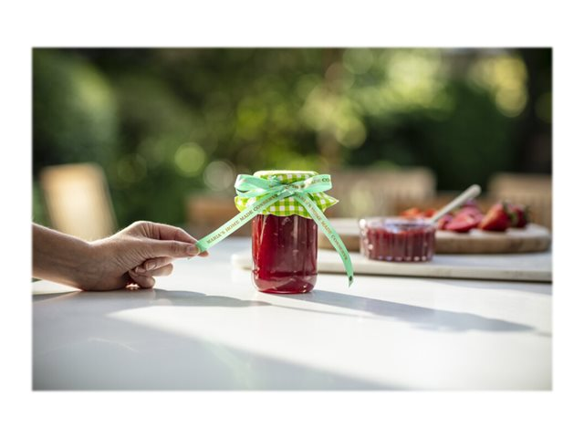 Lors d'occasions spéciales, utilisez le ruban TZe-RM54 avec votre étiqueteuse P-touch pour adresser vos vœux aux personnes qui vous sont chères.  Laissez libre cours à vos talents et personnalisez vos cadeaux, vos cartes et vos créations avec le ruban tissu TZe-RM54 Brother original.